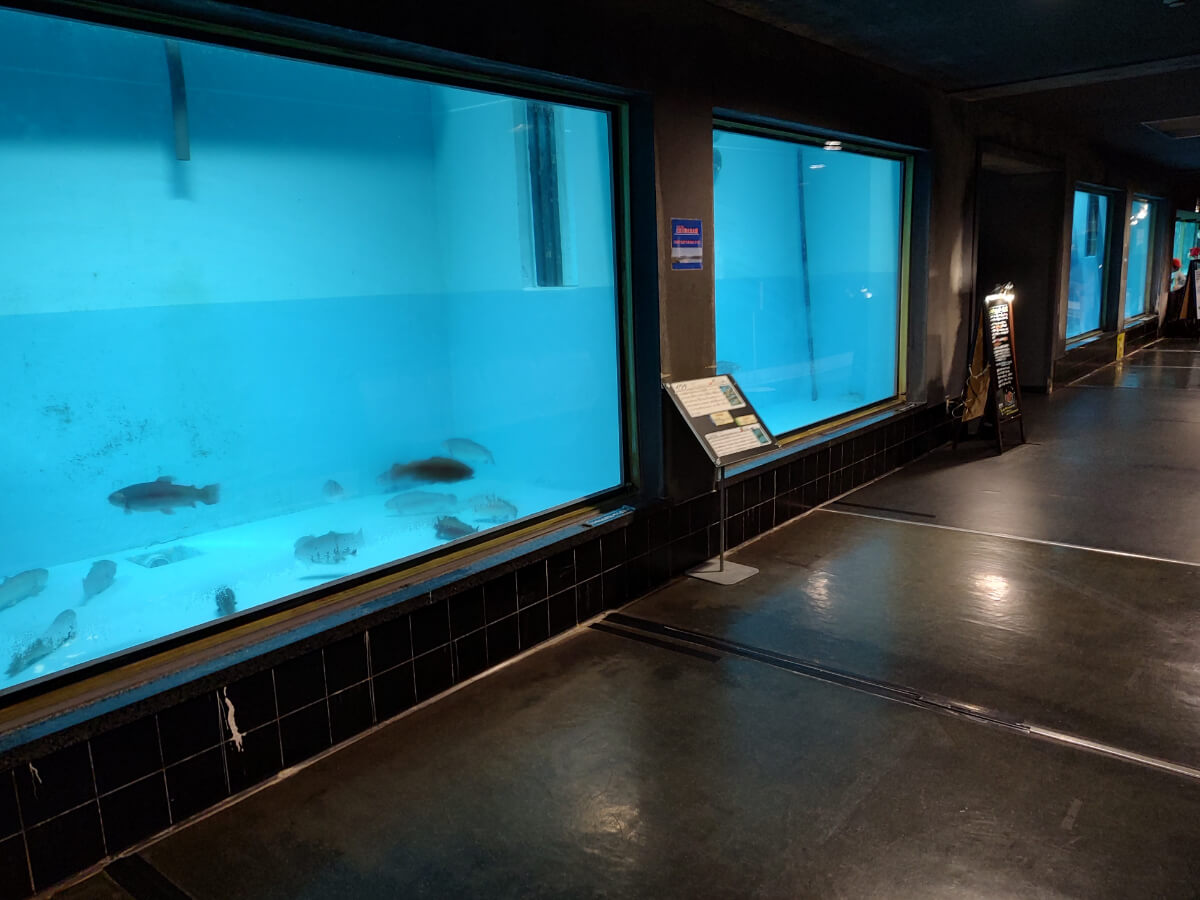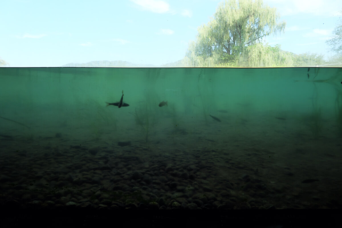 通路の先は広いスペースになっていて、そこでは本物の川に設けた観察窓から、自然のままの魚の泳ぐ様子が、なんと横から観察できる。