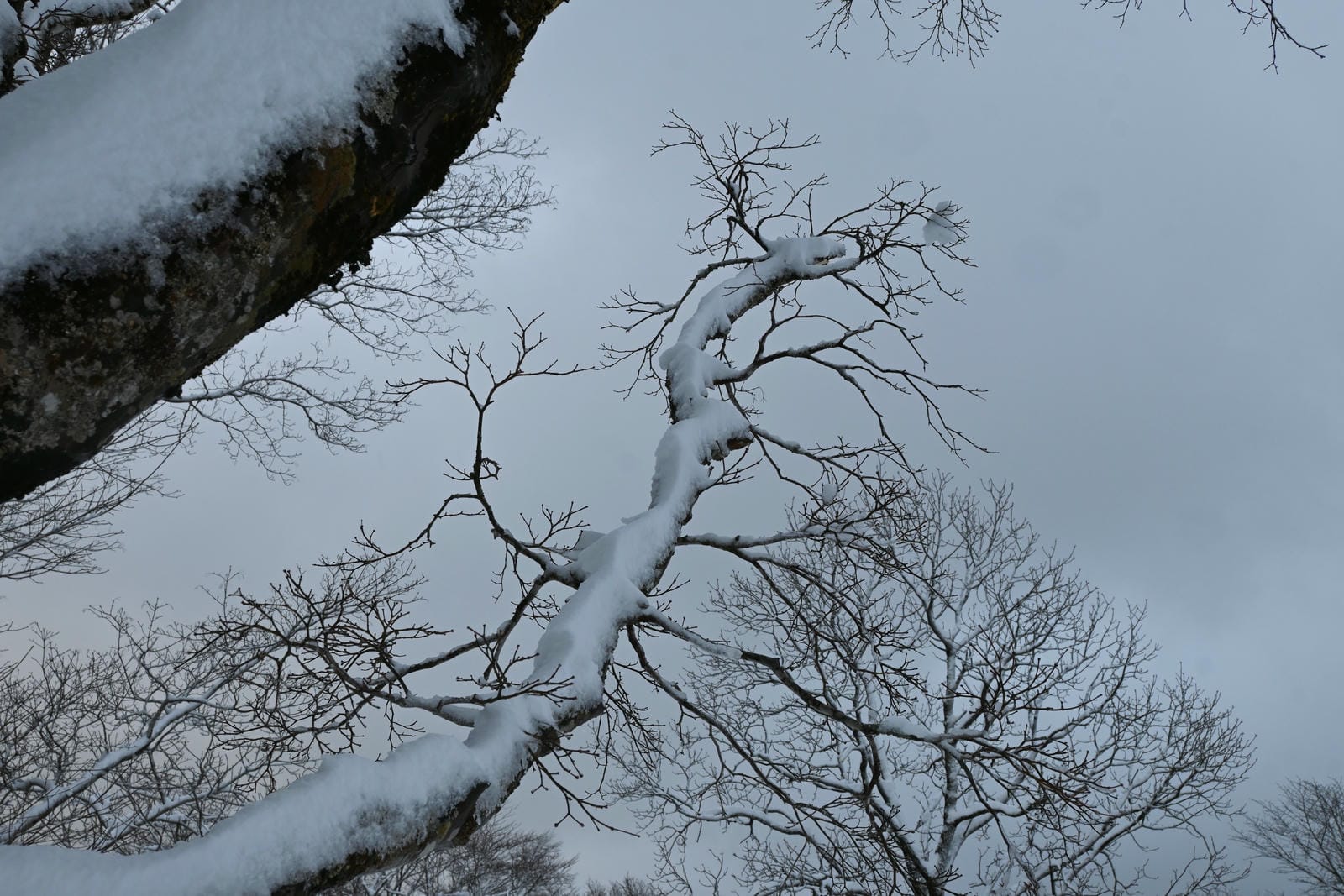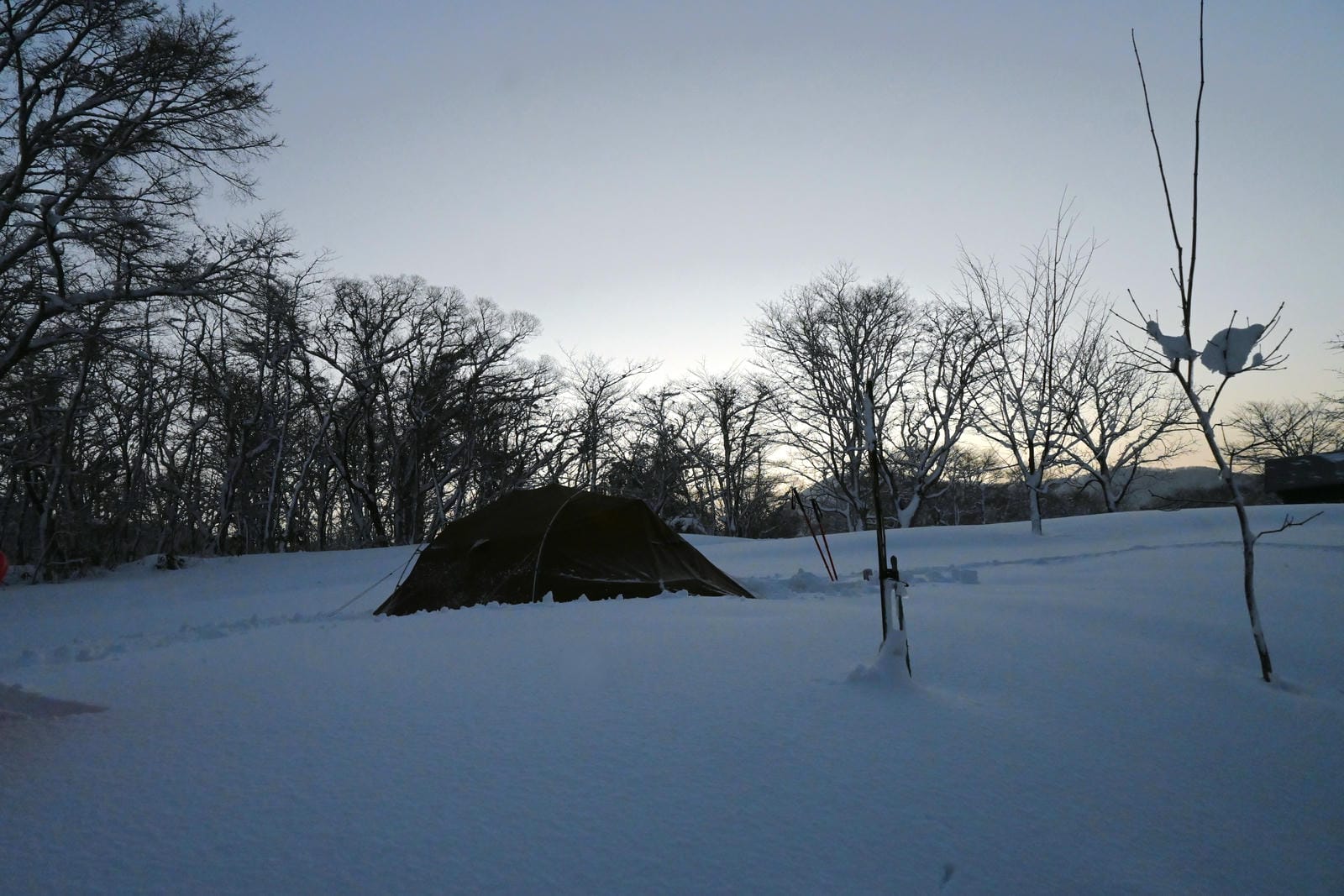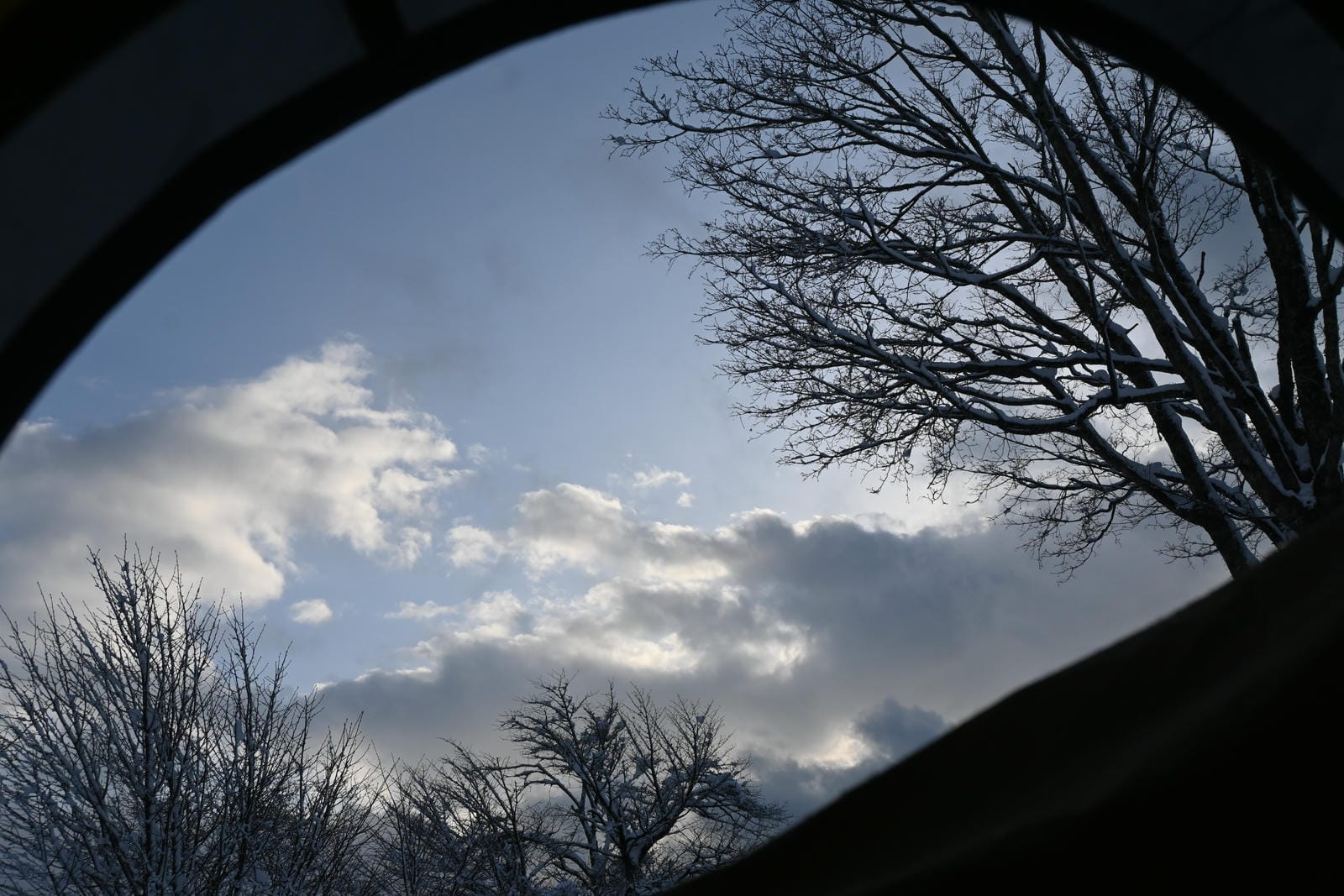 もし朝までこのままだったら片付けが面倒そうだなぁ・・・、なんて考えながらテントチェックしているうちに、つぎの雲が流れてきて、辺りは再び雪のちらつく灰色の中へ戻ってしまいました。