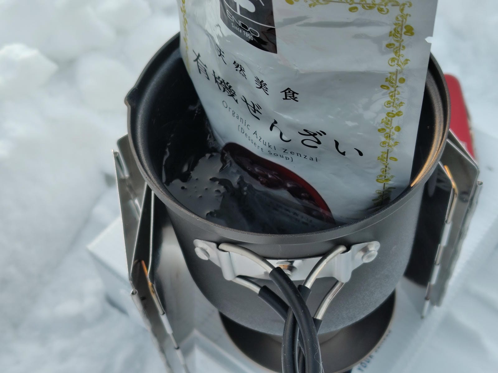 ぼくは普段からおしるこが好きなんだけど、冬キャンプの朝に食べるのは格別です。