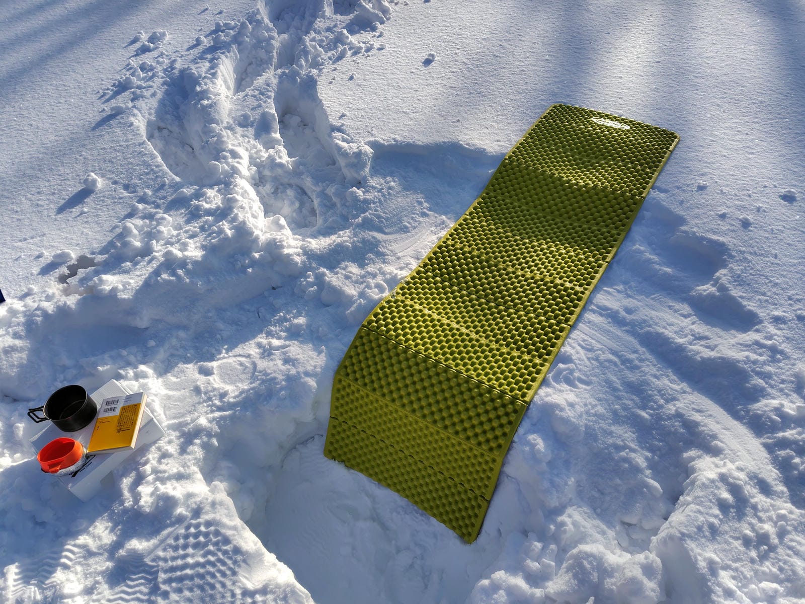 食後、雪の上にマットを広げ、ゴロンと寝転ぶ。